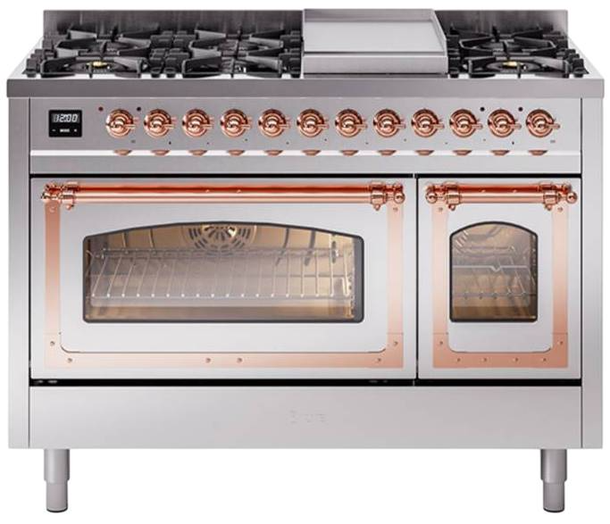 Introducing the new Nostalgie II 48" dual fuel range, a classic addition with a touch of innovation to any kitchen. This range feature sealed burners equipped with total black brass burner that has a non-stick nanotechnological coating, heavy cast iron grates, 3.5 + 1.52 cu. ft. total double oven capacity and soft closing door system.Read More