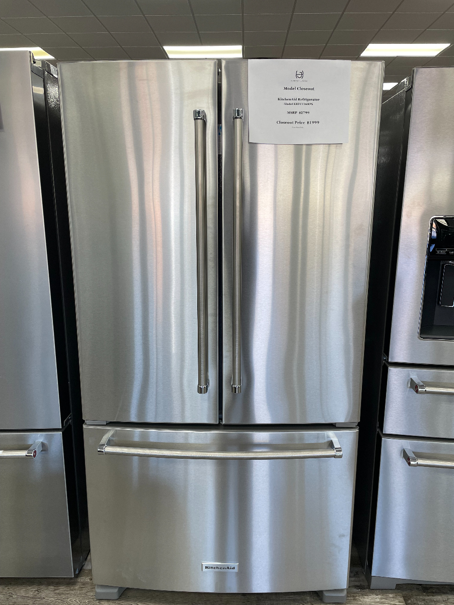 Enjoy freshness within reach. This KitchenAid® counter-depth French door refrigerator features an interior water dispenser to keep the outside looking sleek. Get customizable storage with an adjustable wood-look nesting shelf and convenient space for wide items. This closeout model is a floor model being sold as is with a full manufacturer's warranty. *Please call store to confirm availability*Read More