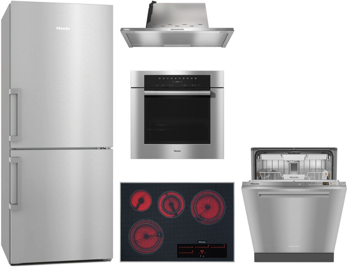 Miele 5 Piece Stainless Steel Kitchen Package with Counter Depth Bottom Freezer Refrigerator, Built In Dishwasher, Single Electric Wall Oven, Electric Cooktop, and Insert Range HoodRead More