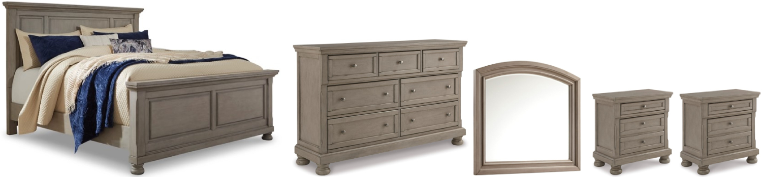 Includes king panel bed (headboard, footboard, rails), dresser with mirror and 2 nightstands