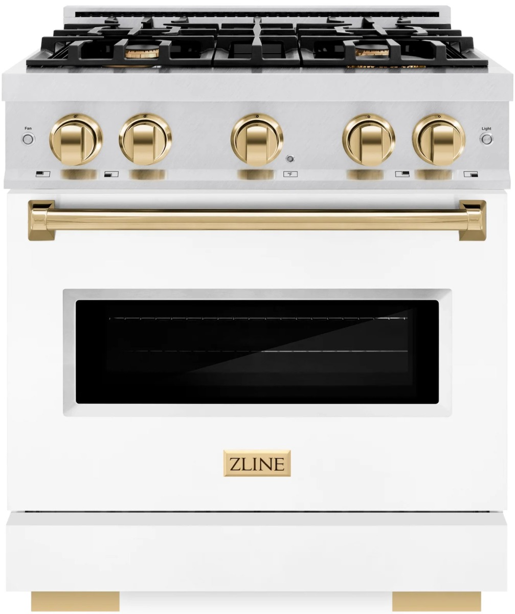 The ZLINE Autograph Edition 30 in. 4.2 cu. ft. Classic Dual Fuel Range with 4 Burner Gas Cooktop and Electric Convection Oven in Satin Stainless Steel with White Matte Door and Polished Gold Accents (CDRSZ-WM-30-G) combines the elegance of a hand-finished porcelain gas cooktop with 4 Italian-made auto-reignition burners, an electric convection oven with an energy-efficient cooling fan to ensure quiet operation, a beautiful white matte door with a Landscape window design, and stunning polished gold knobs and handle allowing you to master every meal.