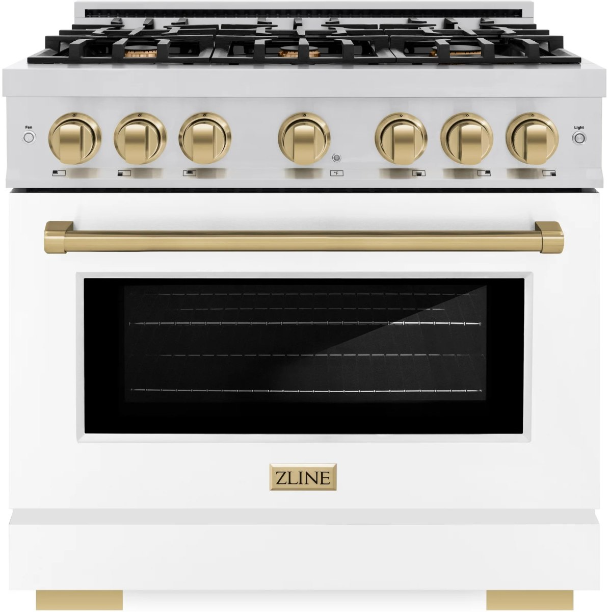 The ZLINE Autograph Edition 36 in. 5.2 cu. ft. Select Gas Range with 6 Burner Cooktop and Convection Gas Oven in Stainless Steel with White Matte Door and Champagne Bronze Accents (HGRZ-WM-36-CB) combines the elegance of a hand-finished porcelain gas cooktop with 6 Italian-made auto-reignition burners, a gas convection oven with an energy-efficient cooling fan to ensure quiet operation, a beautiful white matte door with a Horizon window design, and stunning champagne bronze knobs and handle allowing you to master every meal.